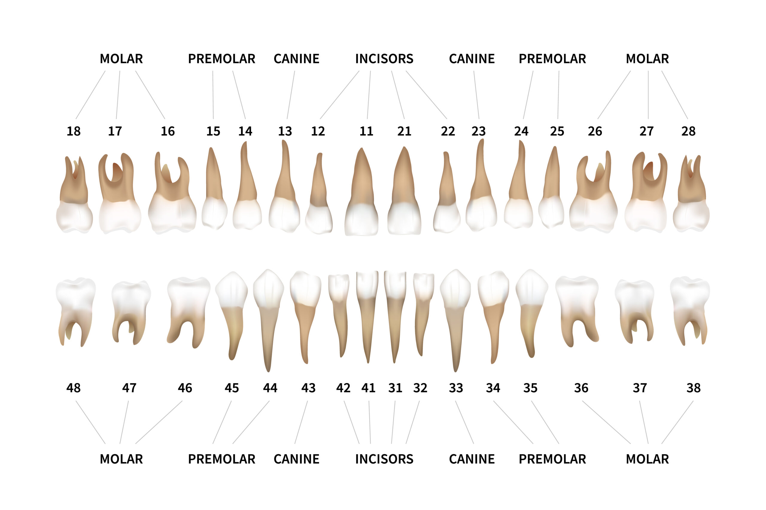 Plusieurs systèmes de numérotation des dents existent à travers le monde. Le système le plus répandu en Europe est le système FDI, qui attribue à chaque dent un numéro composé de deux chiffres. Le premier chiffre indique le quadrant dans lequel se trouve la dent, tandis que le second chiffre précise sa position dans l’arcade dentaire.